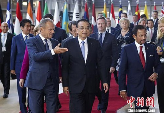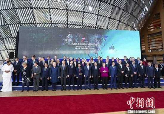 当地时间10月19日上午,中国国务院总理李克强在布鲁塞尔出席第十二届亚欧首脑会议,并率先发表题为《共担全球责任共迎全球挑战》的引导性讲话。中新社记者刘震摄