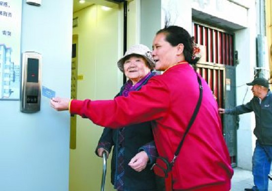 ▲一位老人在家人的搀扶下试刷乘梯卡,体验乘电梯上下楼带来的便利。