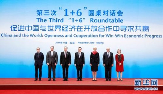 新华社北京11月6日电(记者郑明达)国务院总理李克强6日下午在钓鱼台国宾馆同世界银行行长金墉、国际货币基金组织总裁拉加德、世界贸易组织总干事阿泽维多、经济合作与发展组织秘书长古里亚、金融稳定理事会主席卡尼和国际劳工组织副总干事格林菲尔德举行第三次“1+6”圆桌对话会。会议围绕“促进中国与世界经济在开放合作中寻求共赢”的主题,就当前世界经济走势、维护多边贸易体制等议题深入交流。