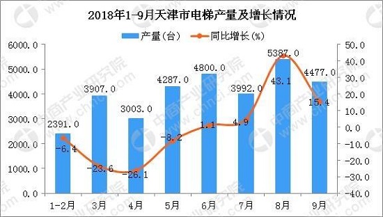 中商情报网讯:据中商产业研究院数据库显示,2018年4-8月天津市电梯产量整体呈增长趋势,2018年9月天津市电梯产量有所下滑;2018年9月天津市电梯产量为4477台,同比增长15.4%。2018年1-9月天津市电梯产量为32244台,同比增长4.8%。