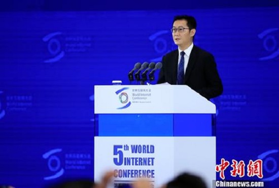 资料图:腾讯公司董事会主席兼首席执行官马化腾演讲。中新社记者杜洋摄