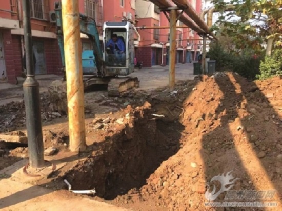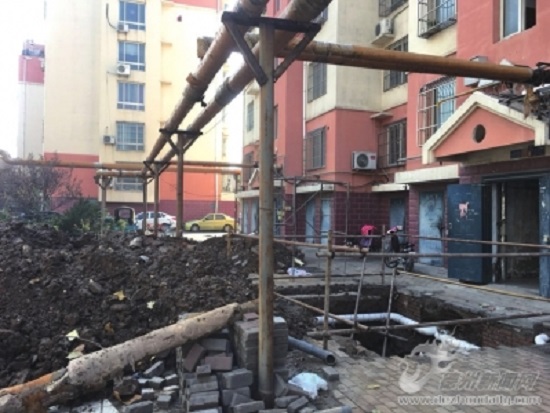 11月12日上午,记者前往该小区看到,距离小区大门最近的三号楼门前正在进行挖掘施工。此外,另两栋单元楼门前已经被挖出了两三米深的大坑,自来水管道清晰地裸露在外面。
