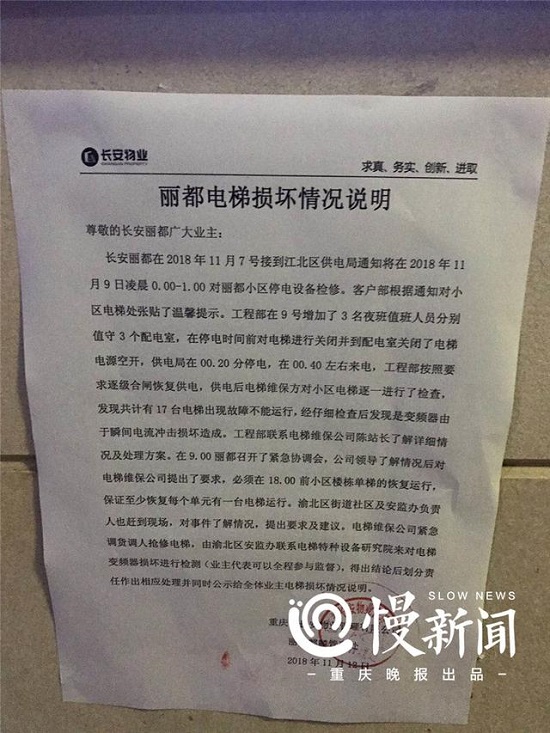 随后,上游新闻·重庆晚报慢新闻记者陪同业主代表找到了小区物管负责人伊主任。对于以上业主的说法,记者进行了复述,他称情况属实。伊主任介绍,11月7日长安丽都物管接到江北区供电公司通知将在11月9日凌晨0:00到1:00对小区停电设备检修。当晚物管增派3位工作人员值守3个配电室,在停电时间前对电梯进行关闭并到配电室关闭电梯电源空开。当晚停电时间为00:20,直到到00:40恢复供电,物管检查发现17台电梯出现故障不能运行。