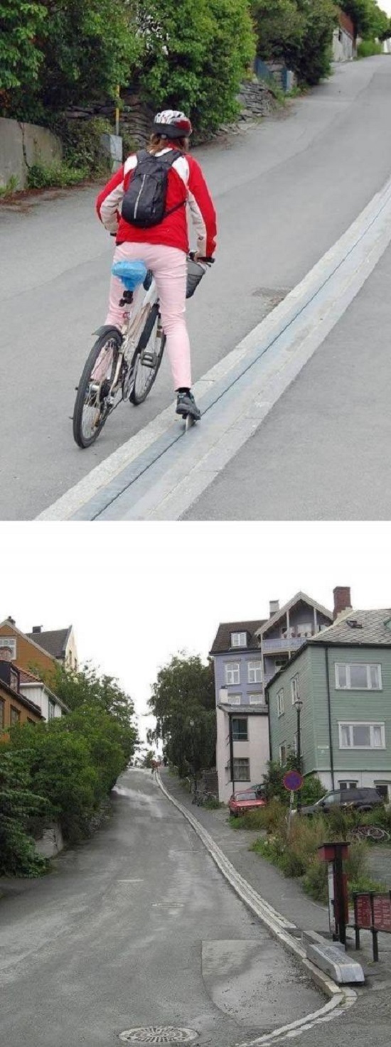 在挪威,骑自行车很普遍,但是在特隆赫姆市部分地区路面过去陡峭,以至于自行车难以骑上去,于是修建了自行车电梯。
