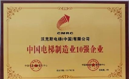 2017年7月,中国市场调查研究中心联合中国社会经济决策咨询中心等多家权威机构以及评审委员会组织专家对申报企业进行综合评价和确认。沃克斯电梯顺利通过复审,再次被认定为“中国电梯制造业十强企业”、“中国电梯行业十大著名品牌”荣誉称号。
