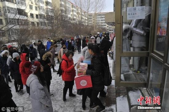 资料图:哈尔滨市某高校,寒冷的冬天大学生们雪地中排队领取双十一快递。图片来源:视觉中国