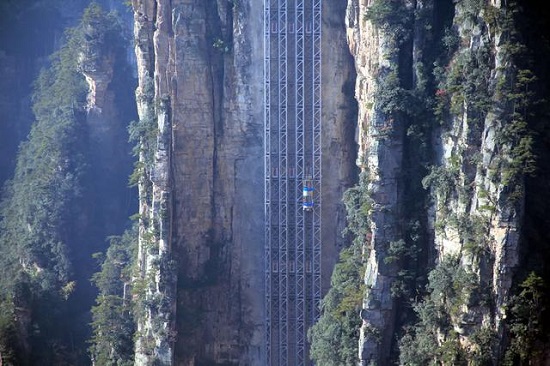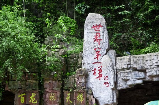 “乘百龙电梯,观张家界美景”——百龙观光电梯位于张家界武陵源世界自然遗产核心景区。