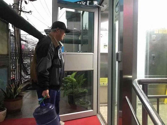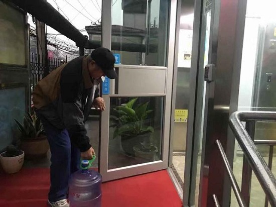 半岛记者在小区采访时,恰好遇到一位60岁左右的老人提着两桶纯净水正要乘坐电梯回家。老人告诉记者,以前小区里没有安装电梯的时候,自己可不敢一个人拎着两大桶水爬平台。“以前没有安装电梯的时候,回趟家都要先爬这个大平台,即使住在1楼,也是够费劲的,现在有了电梯,不需要再爬楼梯了,提两桶水也不吃力”,老人说。