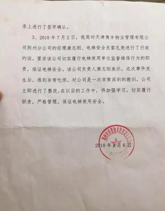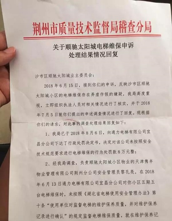 根据业主们反映以及调查取证,今年8月份,荆州市质监局稽查分局也下达了一份处理意见,主要问题确实出在了电梯维保上。