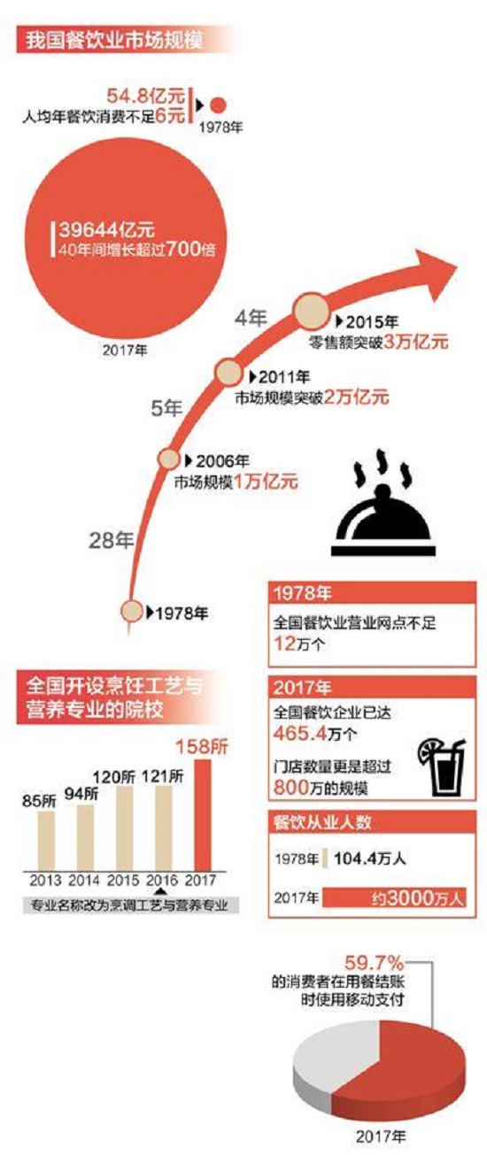 据中国烹饪协会统计,改革开放之初的1978年,全国餐饮业营业网点不足12万个,餐饮从业人数104.4万人;2017年,全国餐饮企业已达465.4万个,门店数量更是超过800万的规模,餐饮从业人数约3000万人,每年新增就业岗位约160万个。“深化改革,继续大力发展餐饮业,对稳定经济发展和扩大就业等方面意义重大。”姜俊贤说。