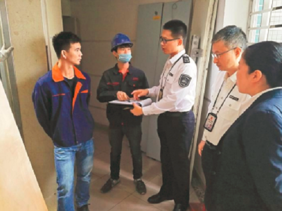 ▲执法人员定期检查旧梯更新施工现场安全管理情况。