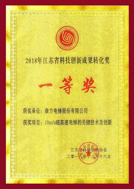 2018年10月8日至11月20日,江苏省科技创新协会举办2018年科技创新奖评奖活动。根据《江苏省科技创新协会科技创新奖励办法》和《江苏省科技创新协会科技创新奖励办法实施细则》的相关规定,经专家组综合评审,康力电梯“10m/s超高速电梯的关键技术及创新”获评2018年江苏省科技创新成果转化奖一等奖。
