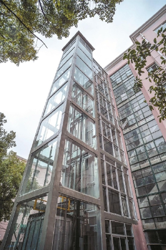 图片说明:新泾六村12号楼加装的透明电梯井/晨报记者任国强