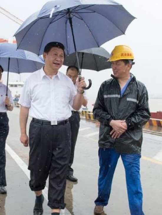 2013年7月21日,习近平冒雨来到武汉新港阳逻集装箱港区考察。来源:新华网