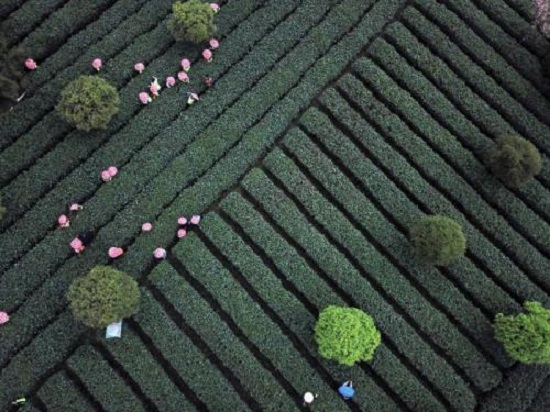 2018年4月1日,孩子们在贵州省遵义市湄潭县湄江街道核桃坝村体验采茶(无人机拍摄)。来源:新华社