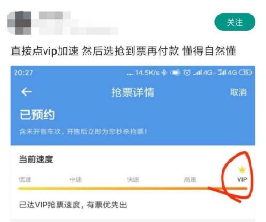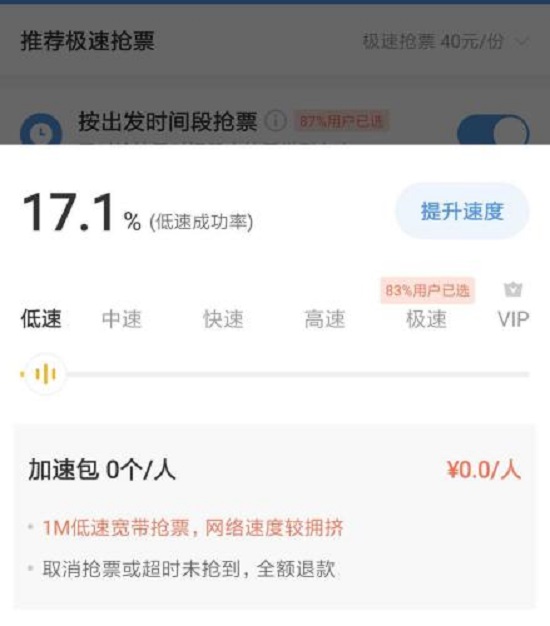 从2018年开始,不少抢票软件都加入了好友帮忙点击链接获取加速包的功能,经过一年的普及,这项功能已经不再独特。为寻找新的利润点,各家平台开始加入新的增值服务,其中最独特的就是传说中的“优先出票”功能。