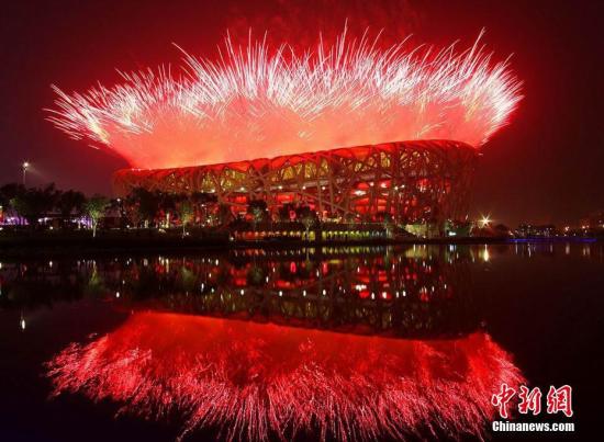 资料图:北京奥运会开幕式,巨大华丽的烟火表演在鸟巢上空达到高潮,北京为全球观众献上了一出极为壮观的视觉盛宴。中新社发孙洪杰摄