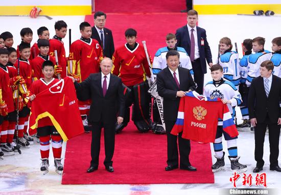 资料图:2018年6月8日晚,中国国家主席习近平同俄罗斯总统普京在天津共同观看中俄青少年冰球友谊赛。两国元首同小队员们亲切交谈、合影,并共同为比赛开球。中新社记者刘震摄