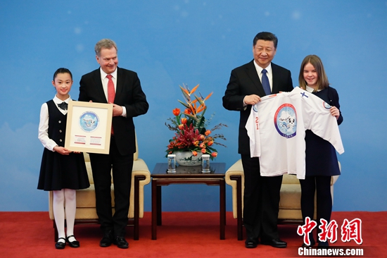 1月14日,中国国家主席习近平同芬兰总统尼尼斯托在北京共同出席“2019中芬冬季运动年”启动仪式。中芬两国少年儿童分别向两国元首赠送中芬冬季运动年标识和纪念品。中新社记者杜洋摄