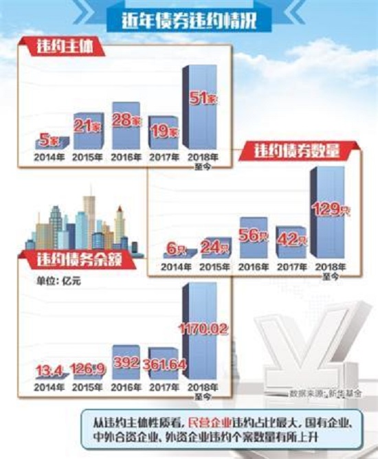 新华基金统计显示,自2014年至今,违约主体、首次违约主体、违约债券数量、违约债务余额等4大指标均呈现明显上升趋势。其中,违约主体分别为5家(2014年)、21家(2015年)、28家(2016年)、19家(2017年)和51家(2018年至今);违约债券数量分别为6只(2014年)、24只(2015年)、56只(2016年)、42只(2017年)、129只(2018年至今);违约债务余额分别为13.4亿元(2014年)、126.9亿元(2015年)、392亿元(2016年)、361.64亿元(2017年)、1170.02亿元(2018年至今)。
