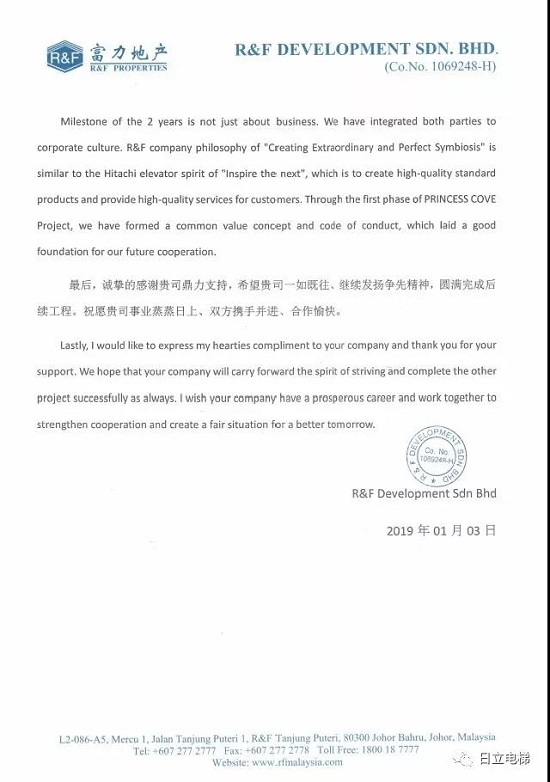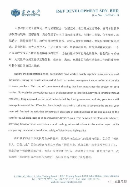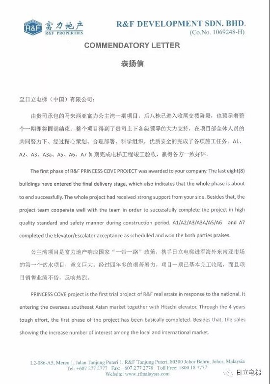 △表扬信中提到,"两年多的合作不仅仅是业务的往来,更是双方企业文化的碰撞与交融。富力的‘创建非凡、至善共生‘的企业理念与日立电梯的‘天天向上、追求卓越‘的企业精神异曲同工,都是为客户创造优质的产品,为客户提供优质的服务。通过整个公主湾一期的合作,我们形成了共通的价值理念和行为规范,为后面的合作奠定了良好基础"。