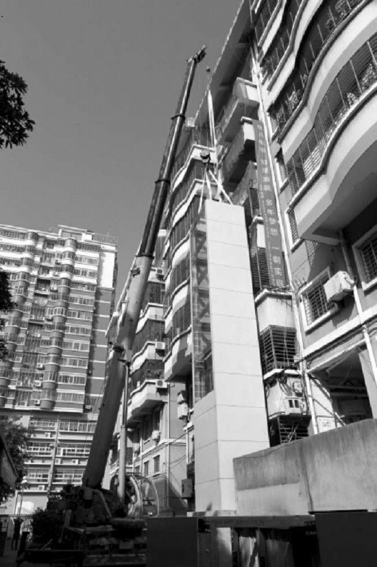 施工时,吊车吊起电梯立方体,放入住宅楼前预留好的位置,像搭积木一样组装起来。工人们熟练地用螺丝进行加固,并在楼梯转台安装连接的钢架走廊,紧接着第二节、第三节、第四节电梯立方体顺利叠加……一座约20米的电梯井道拔地而起,安装过程只用了2小时。