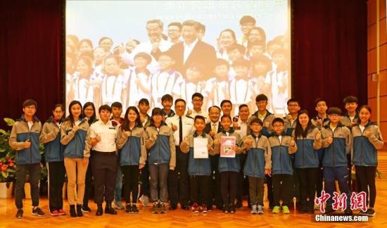 资料图:2018年2月15日,中央政府驻港联络办公室主任王志民邀请郭宏晞、罗颢凝同学等26位香港“少年警讯”成员来到中联办大楼,向他们转交了习近平主席的回信,转达了习主席对香港青少年的关心和问候。中新社记者徐冬冬摄