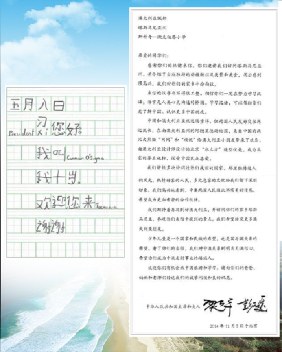 2014年,澳大利亚塔斯马尼亚州16名小学生给习近平和夫人彭丽媛写了一封信,用稚嫩的汉字邀请他们访问自己的家乡。习近平和彭丽媛在回信中说,“我们期待着再次到访澳大利亚,并访问你们的家乡塔斯马尼亚,参观你们来信中提到的景点。我们希望结交更多澳大利亚朋友”。不久后,习近平和彭丽媛访澳期间赴塔斯马尼亚州,专门抽出时间与这些孩子交流。这段“万里信缘”成为一则外交佳话。