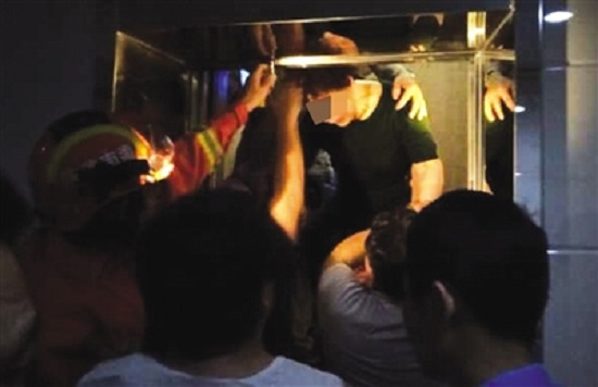 消防救援人员随即火速开展救援,在救援过程中发现电梯门已被电梯锁钩锁上,无法使用电梯三角钥匙打开故障电梯,必须从上一楼层进入将故障电梯的电梯锁钩打开,才可以将被困楼层的电梯门打开。由于电梯里的被困人员情绪激动,造成缺氧现象,消防救援人员只好用最快的速度爬入电梯井将电梯锁钩打开。