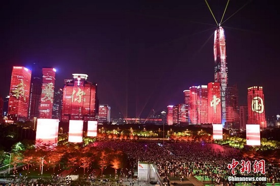 资料图:深圳上演主题为“辉煌新时代”的中心区灯光表演。中新社记者陈文摄
