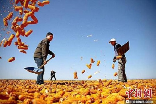 资料图。农民挥动铁锨晾晒玉米,使得满地尽带“黄金甲”,成为一道靓丽的风景线。赵琳摄