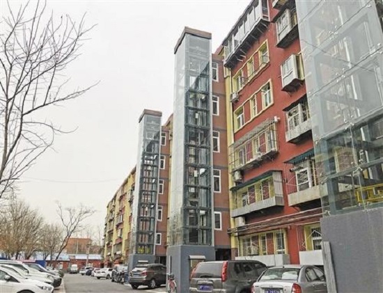 今年1月份,位于北京市海淀区学院路街道二里庄小区43号楼的5部电梯正式投入使用。记者在现场看到,这座6层楼红色的楼面外设有5个电梯井,为老楼增加了几分现代感。楼门向北伸出的电梯间以钢筋为骨、玻璃为幕,电梯轨道清晰可见。
