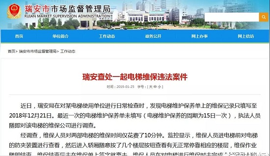【内容提要】电梯维护保养周期为多少天一次?一次电梯维保的时间该是多久?电梯维保的项目都有哪些?电梯维保分为月检、周检……关于电梯维保的这些问题,你真的了解吗?你关心过自家小区楼宇的电梯么?近日,浙江省瑞安市场监督管理局在对某电梯使用单位进行日常检查时,发现维保单位存在违法违规行为,并作为典型案例立案查处。