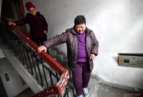 住在4楼的熊婆婆患有糖尿病,因为并发症,视力很不好,从上一层楼到余爹爹家来串门都要摸索七八分钟。熊婆婆说,有电梯的时候,她还经常下楼去转转,现在电梯停了,她下楼得扶着扶手摸索半天。