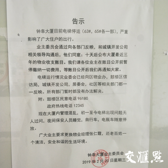 采访中,交汇点记者发现,钟阜大厦居民和物业矛盾积压已久。“卫生脏乱差,保安也不负责,大半夜回来保安室都没人,残疾人通道经常乱停车,再加上电梯的事一直没解决,大家怨声载道。另一位居民告诉交汇点记者,“今年1月份我们成立了业主委员会,业委会将业主缴纳的物业费进行了统计,打算和物业那边进行核对。”