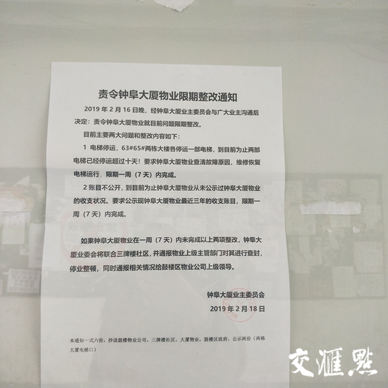 记者在现场看到,钟阜大厦门口右边过道的公告栏上贴着两份告示,一份内容是2月20日钟阜大厦业主委员会要求将物业账目公开,还有一份的内容是2月18日业主委员会责令钟阜大厦物业限期整改。