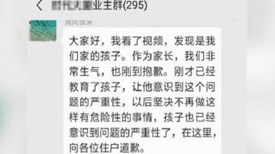 随后,该业主很快就把这个问题反映到了物业那里。物业在调取了监控录像后,发现确有此事,就把这段视频放到了由业主组建的小区群中。在群里,一名男子很快就辨认出这是他们家的孩子,立刻向各位业主道了歉。