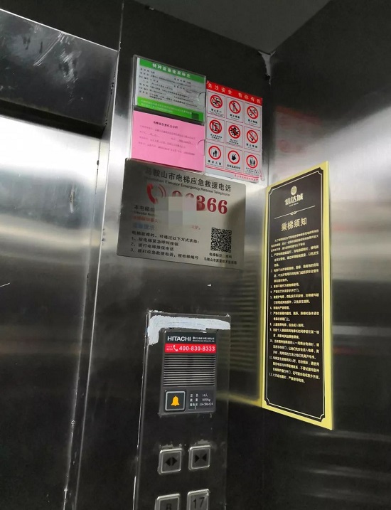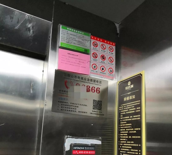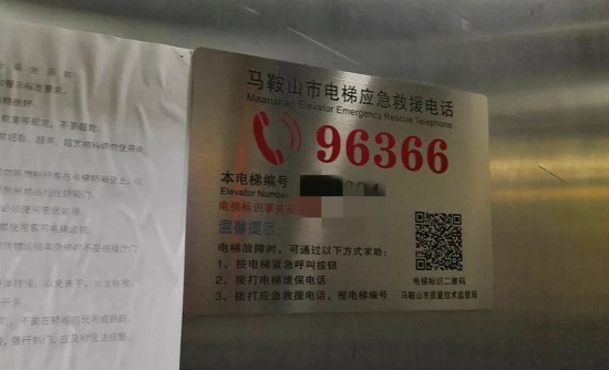 记者注意到,在这电梯间内,除了张贴了一块印有“马鞍山市电梯应急救援电话”标牌及电梯合格标识外,并没张贴“ **网络已覆盖”的标牌。