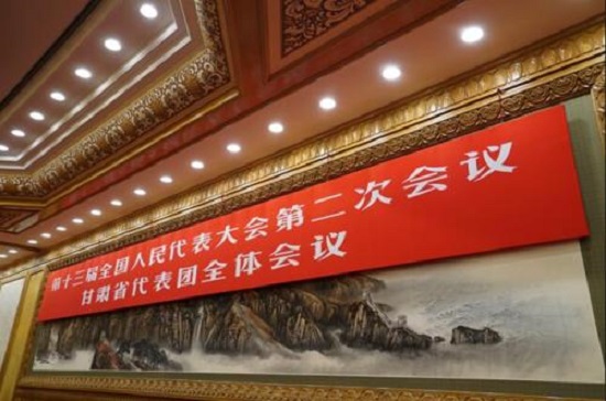 △人民大会堂东大厅的会标更换成了甘肃代表团。(央视记者张晓鹏拍摄)