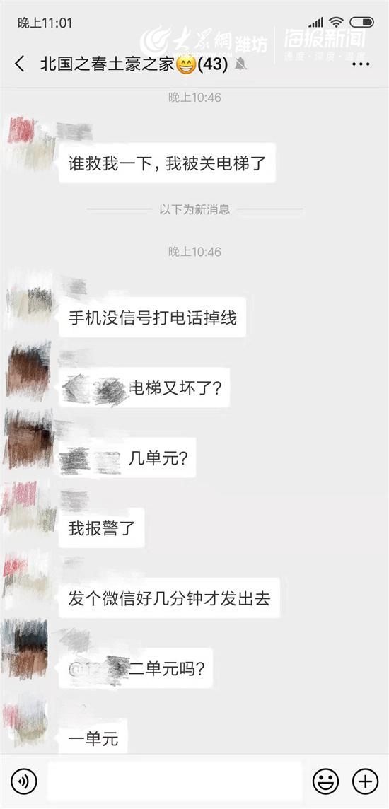 大众网潍坊·海报新闻3月11日讯(记者 刘晓雨)“谁救我一下,我被关电梯了!”3月10日晚22时46分,北国之春小区业主谭先生在业主群内发出求救,表示单元电梯发生了坠梯,自己被困其中。