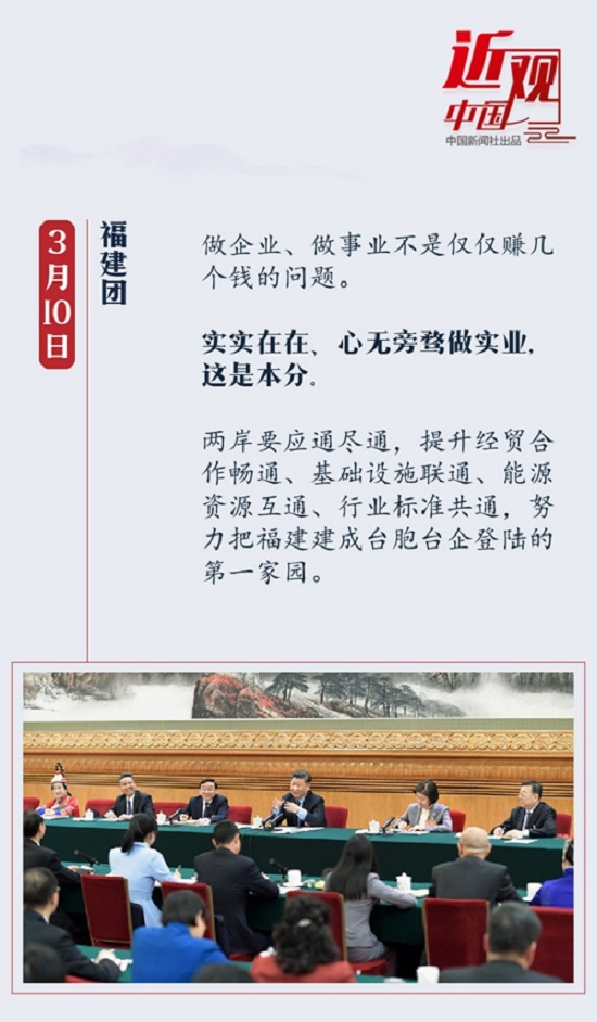 在福建团,习近平听了安踏公司董事局主席、总裁丁世忠讲述福建民营企业的发展情况后指出,做企业、做事业,不是仅仅赚几个钱的问题。做实体经济,要实实在在、心无旁骛地做一个主业,这是本分。