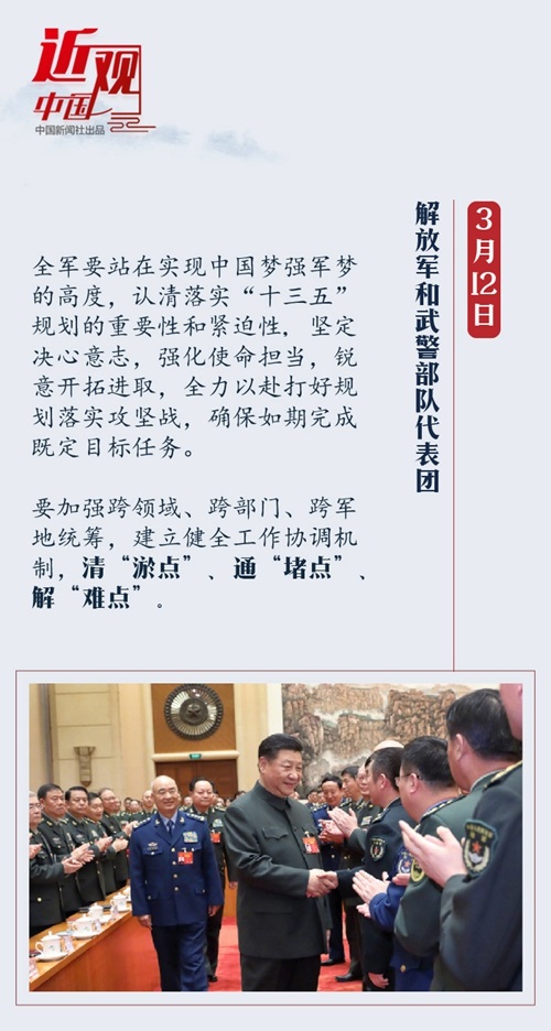 在解放军和武警部队代表团,习近平着重谈到推进军队建设发展“十三五”规划落实,要求“加强统筹协调,加强重点突破,加强责任落实,扭住不放,务期必成”。