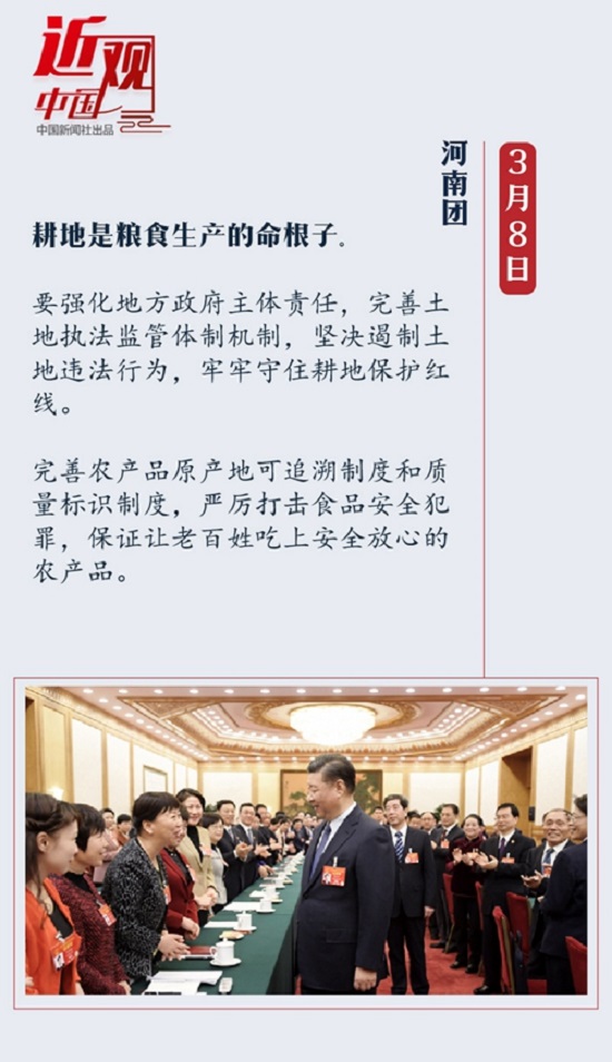 在河南团,他为粮食安全“开方”,强调要强化地方政府主体责任,完善土地执法监管体制机制,坚决遏制土地违法行为,牢牢守住耕地保护红线。