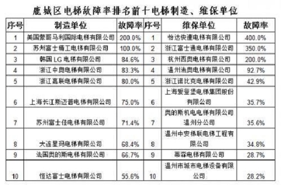 日前,鹿城区市场监督管理局发布《电梯质量安全报告》。数据显示,鹿城区平均每天发生2.6起困人事故。《报告》中公开了2018年在鹿城电梯维保单位量化评价等级,并将电梯故障率(电梯发生故障次数/在鹿城电梯量),以及电梯困人次数最高的前十名制造、维保和物业管理单位进行公布。
