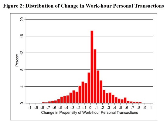 证据表明,接受测试的样本中,信用卡交易的整体额度并没有上升,只是工作时间内交易的频率大大提高了。其次,研究者发现居住在这三个城市中的未就业人口,刷卡行为没有受到任何影响。这表明观察到的效果是捕捉到了当地上班族的普遍反应。在这三个城市中,60%的有产雇员在上班时间进行个人交易的倾向增加,说明研究结论不是由个别异常的个人带动的。