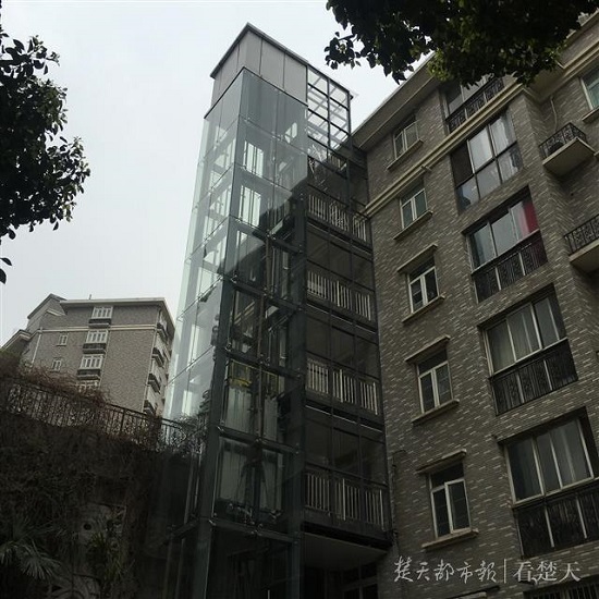 昨日,记者看到,崭新的电梯靠近小区的围墙,远远望去,就像是一根银白色的烟囱,从地面紧贴外墙升至6楼,走进电梯内,有6个楼层的按键,考虑到老人身体状况,工作人员特地调低了电梯升降的速度。