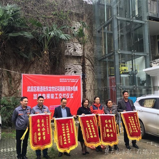 昨日上午,武昌区东龙社区星河居小区新装电梯投入使用,一根10多米高的银色“烟囱”矗立在小区单元楼前时,居民们既惊叹又喜悦:我们也是有电梯的小区了。