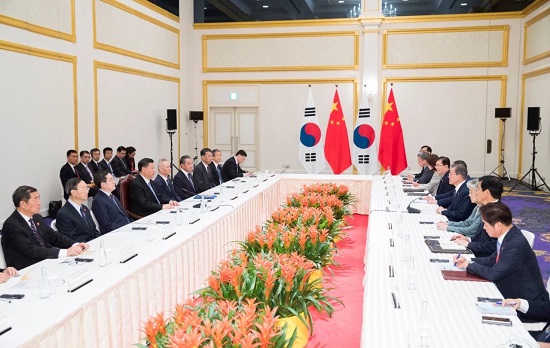 习近平指出,加强中韩友好合作符合历史潮流,也是两国人心所向。中方愿同韩方坚持以诚相待,努力实现合作共赢,推动两国关系不断向前发展,并为朝鲜半岛和地区和平稳定作出贡献。双方要保持各层次沟通,把稳双边关系发展大方向。要把握共建“一带一路”机遇,加快中韩自由贸易协定第二阶段谈判,不断扩大贸易、科技、财经、环保等领域合作。要积极开展人文交流,巩固中韩民间友好。中韩合作完全是互利双赢的,不应该受到外部压力影响。希望韩方继续重视、妥善处理好两国间有关问题。双方要加强在联合国、二十国集团等多边框架内的协调,共同反对保护主义,支持多边主义和自由贸易体制,推动构建开放型世界经济。