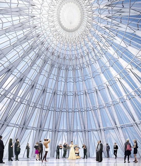 水晶型顶盖高达68.4米,采用了轻质空间结构,以适应建筑斜肋构架的体量,并在顶层天际大厅实现最大化的开放空间,即使举办一场小型音乐会也毫无压力。