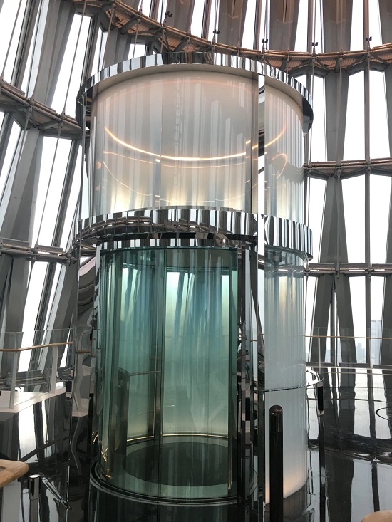 另外,还有一台设计精美别致的圆形玻璃观光电梯,承担了从天际大厅到观景平台的通勤任务。